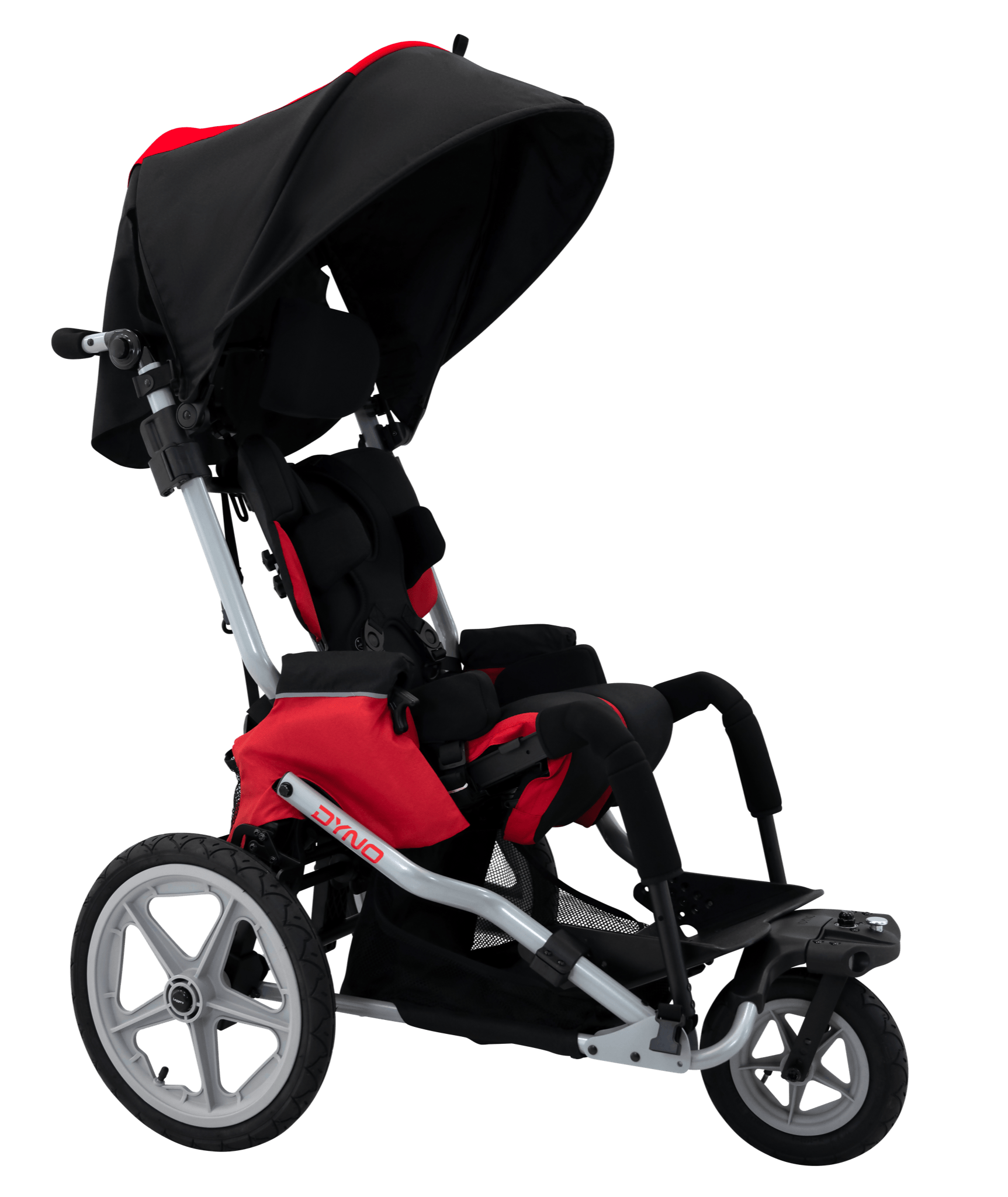 Active lifestyles need active strollers. The Dyno provides positioning for postural support while allowing controlled dynamic movement of the child. The DYNO 3 wheel frame is built for all types of terrain. With our built-in suspension, jogging and traveling are made easy. The Dyno folds in one easy step, making life easier for families on the go.